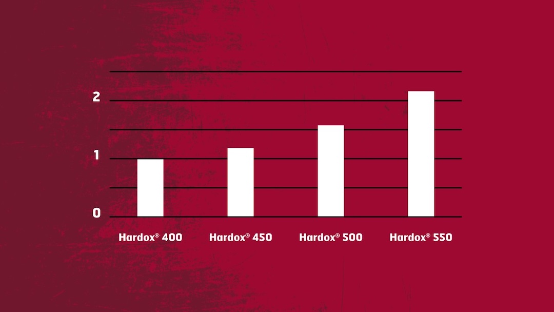 هارداکس ۵۵۰ به تجهیزات شما معادل ۶۰٪ طول عمر بیشترمقای سه با فولادهای متداول ۵۰۰ برینلی بسته به نوع کاربرد میدهد.نه تنها طول عمر تجهیزات اضافه میشود بلکه بازه سختی ۵۲۵-۵۷۵ برینل به شما امکان پیش بینی طول عمر و برآورد زمان تعمیرات را میدهد.